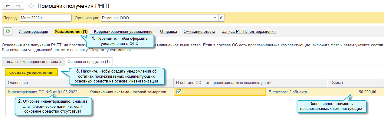 Для основных средств, в составе которых есть прослеживаемые комплектующие, в уведомлении необходимо вручную указать остаточную стоимость этих комплектующих. Рекомендуется рассчитать её исходя из доли стоимости комплектующих в стоимости основного средства (Письмо ФНС России от 01.09.2021 № ЕА-4-15/12338@).