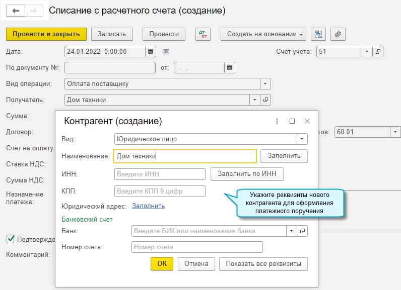 Для быстрого оформления счета, платежного поручения или других документов по новому контрагенту теперь можно заполнять только те реквизиты контрагента, которые необходимы для конкретного документа. Функционал доступен в простом интерфейсе.