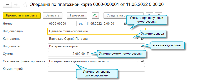 Добавлена возможность учитывать поступление целевого финансирования через эквайринг с платежных карт доноров.