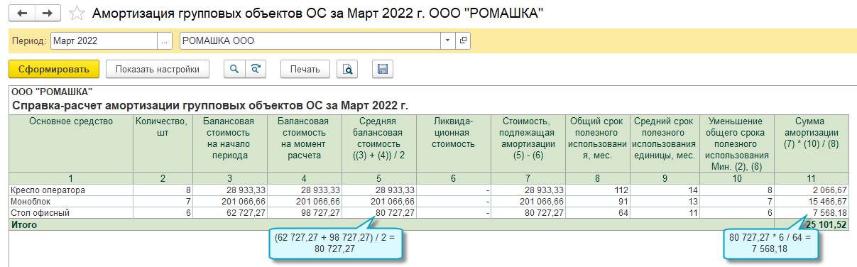 По групповым объектам расчет амортизации выполняется исходя из принципа рациональности: учитывается изменение балансовой стоимости не по дням, а в среднем за месяц. В расчете амортизации используется средняя балансовая стоимость группового объекта за месяц.