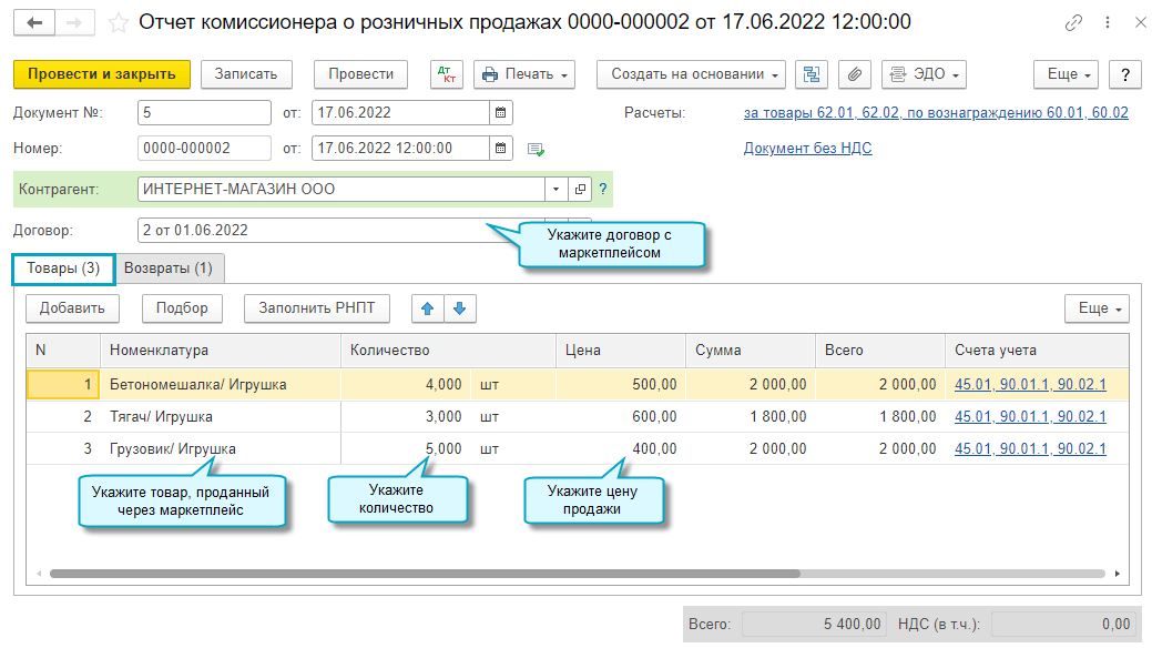 Используйте документ Отчет комиссионера о розничных продажах для отражения в учете розничных продаж через маркетплейс и возврата товара покупателем.