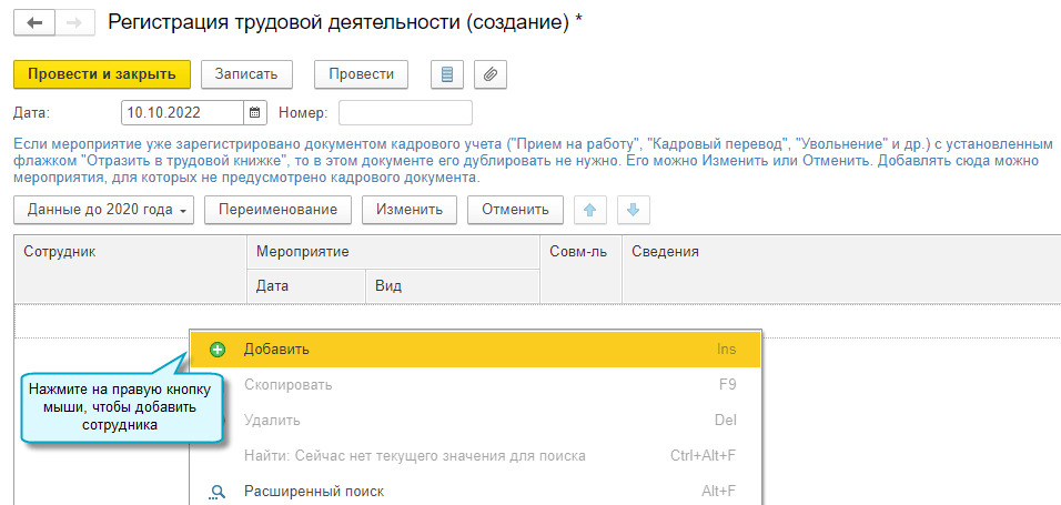 Простой интерфейс: меню "Сотрудники - Электронные трудовые книжки - Регистрация трудовой деятельности".