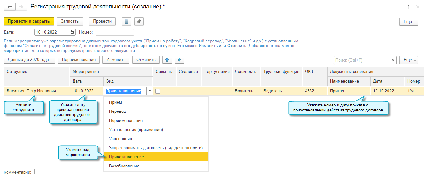 Для отражения в отчетности приостановки трудовых договоров на период мобилизации добавлены: