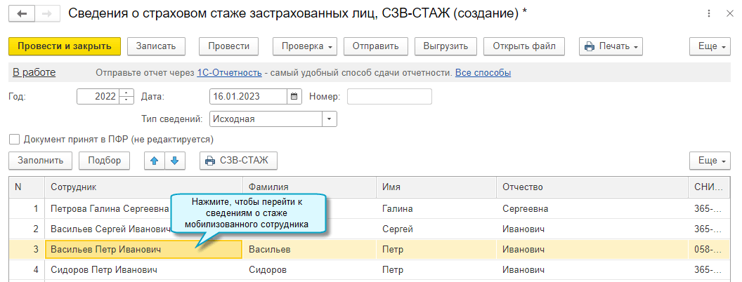 Полный интерфейс: меню "Зарплата и кадры - Страховые взносы - ПФР. Пачки, реестры, описи - Сведения о страховом стаже застрахованных лиц, СЗВ-СТАЖ".