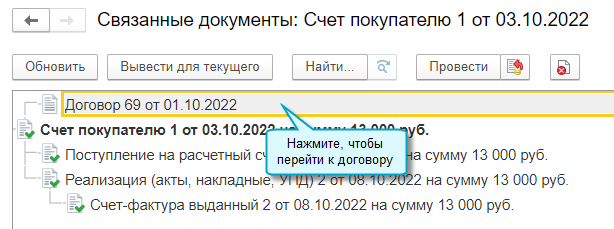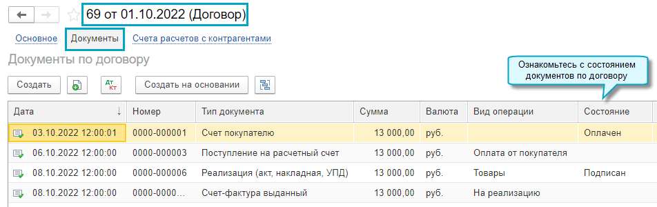 Повышено удобство работы с документами в разрезе договоров (сделок). Теперь договор с контрагентом выводится в схеме связанных документов. А в списке документов по договору имеется колонка Состояние для наглядного контроля исполнения этого договора.