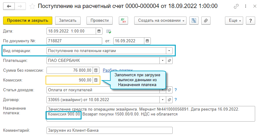 Добавлено заполнение суммы комиссии банка по эквайрингу суммой, указанной в назначении платежа, при загрузке банковской выписки.