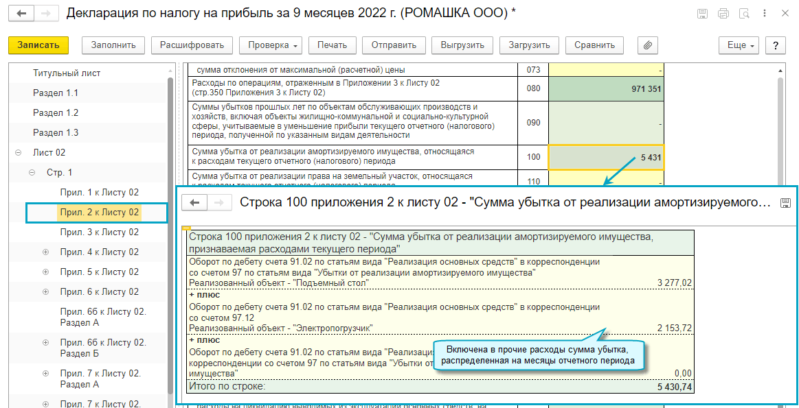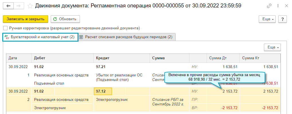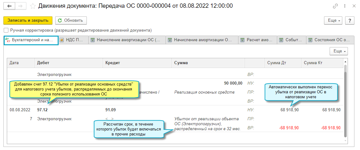 Упрощен учет убытков после реализации амортизируемых основных средств. С 01.01.2023 при передаче основного средства рассчитываются убыток и срок, в течение которого убыток ежемесячно равными долями включается в прочие расходы по налогу на прибыль (пункт 3 статьи 268 Налогового кодекса РФ). Сумма убытка учитывается в налоговом учете на новом счете 97.12 "Убытки от реализации основных средств".