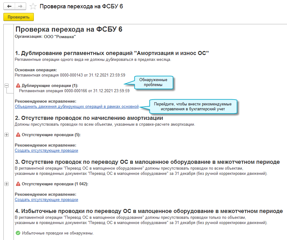 Добавлена возможность проверить наличие проблем, возникших при обновлении начиная с версии 3.0.117, в связи с переносом проводок по переходу на ФСБУ 6/2020 в межотчетный период, и автоматически их устранить.