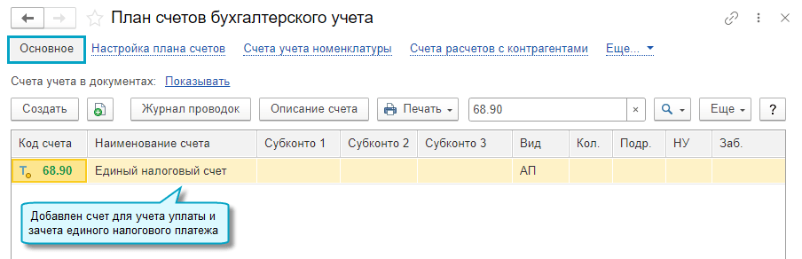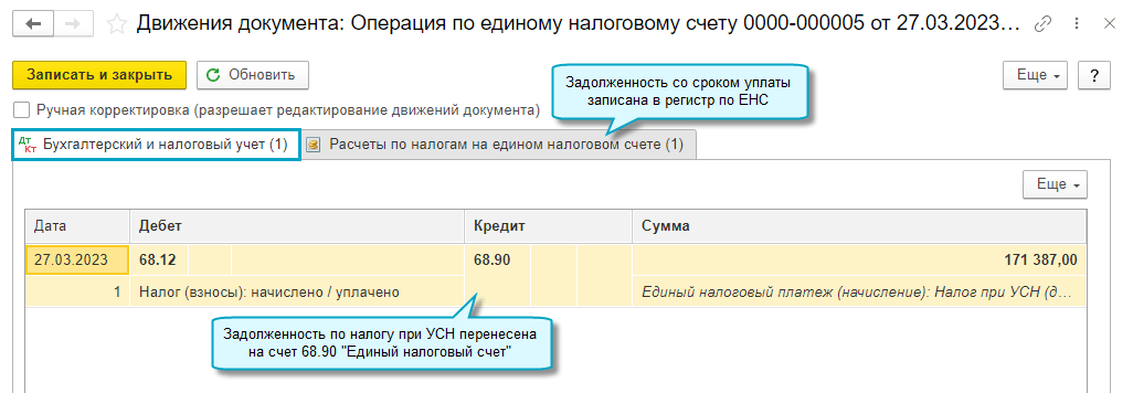 Добавлена возможность автоматически переносить задолженность по начисленным налогам и страховым взносам на счет 68.90 "Единый налоговый счет", чтобы формировать на нем совокупную обязанность по уплате налогов и взносов (п. 5 ст.11.3 Налогового кодекса РФ).