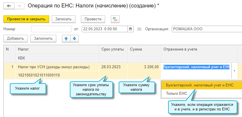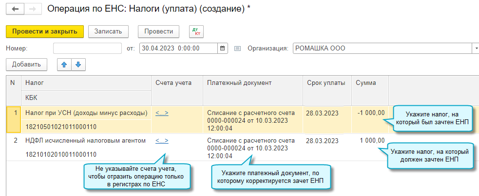 Добавлена возможность корректировать автоматический зачет ЕНП на уплату налогов и взносов, отражать в учете другие операции на едином налоговом счете без подачи уведомлений по исчисленным суммам налогов.