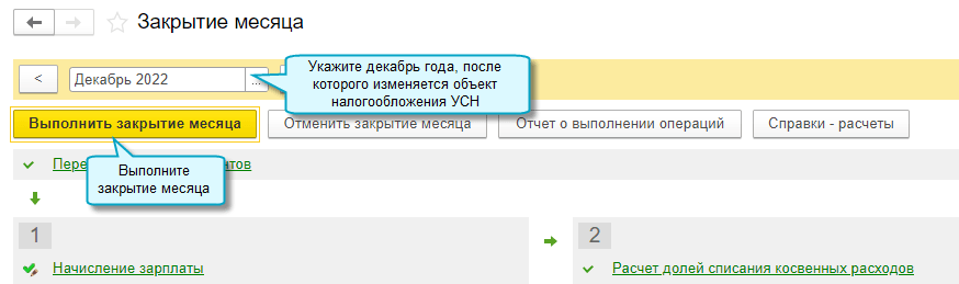 Полный интерфейс: меню "Операции - Закрытие периода - Закрытие месяца".