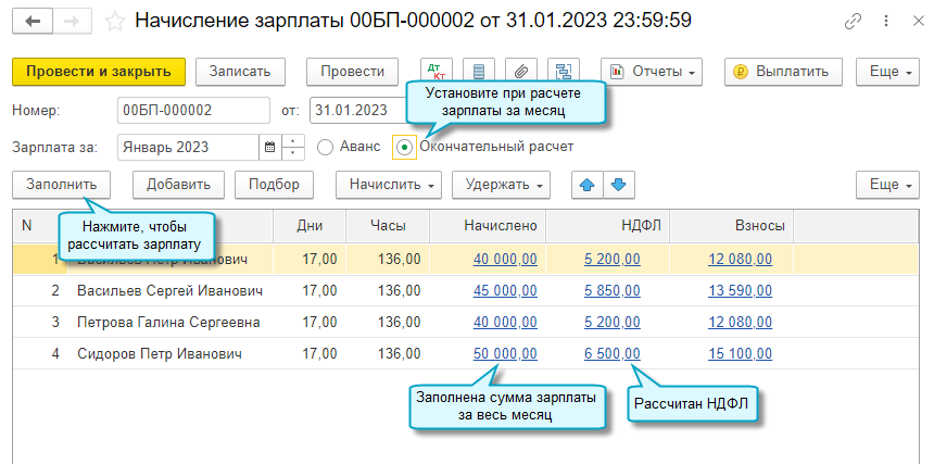Простой интерфейс: меню "Сотрудники - Начисления - Начисление зарплаты".