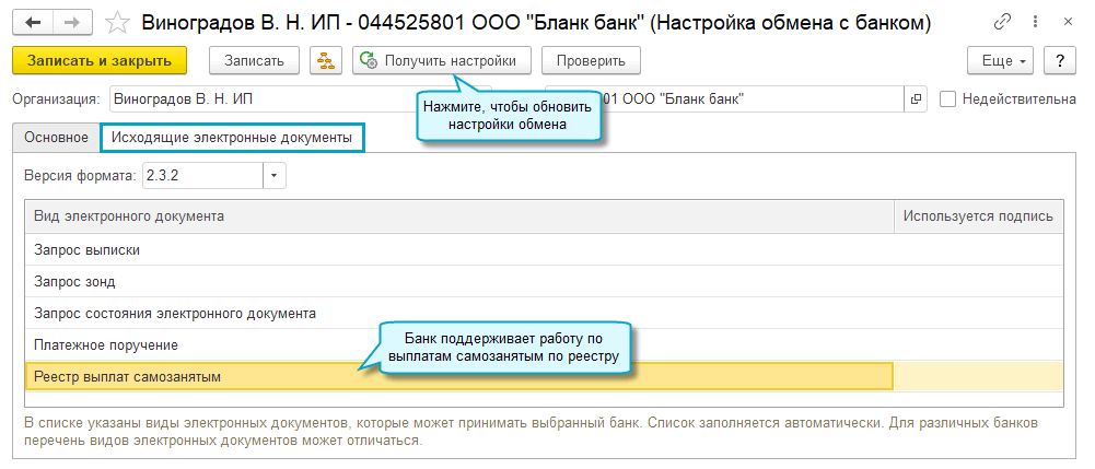 Добавлена возможность через сервис 1С:DirectBank отправлять в банк реестр выплат самозанятым и загружать чеки самозанятых. Список банков, поддерживающих обмен реестрами самозанятых, находится здесь.