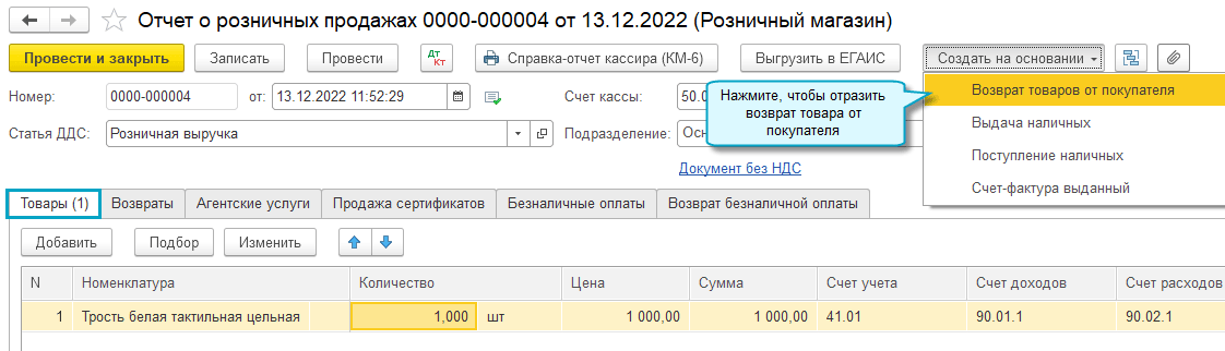 Возврат на основании отчета о розничных продажах используется, когда чек при продаже товара не был пробит в приложении, где оформляется возврат. В этом случае продажа товара отражается в учете отчетом о розничных продажах.