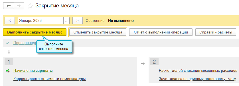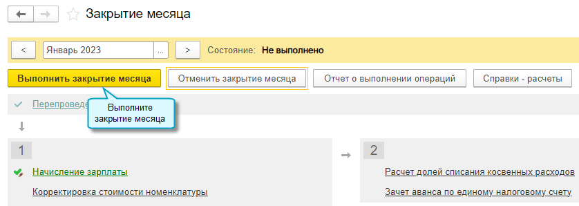 Полный интерфейс: меню "Операции - Закрытие периода - Закрытие месяца".