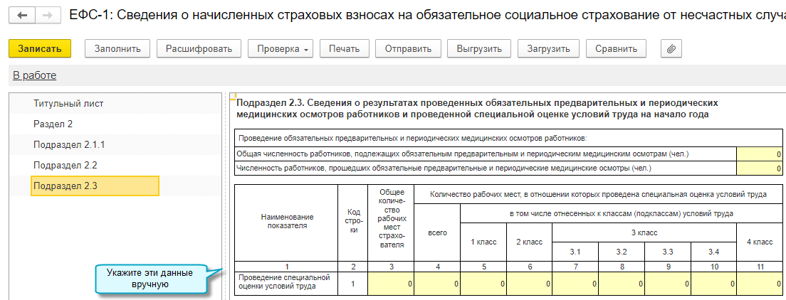 Добавлено автозаполнение раздела 2 "Сведения о начисленных страховых взносах на обязательное социальное страхование от несчастных случаев на производстве и профессиональных заболеваний" формы ЕФС-1. Это замена отмененной формы 4-ФСС. Представляется в Социальный фонд России (СФР) начиная с отчетности за 1 квартал 2023 года (Постановление Правления ПФ РФ от 31.10.2022 № 245п).