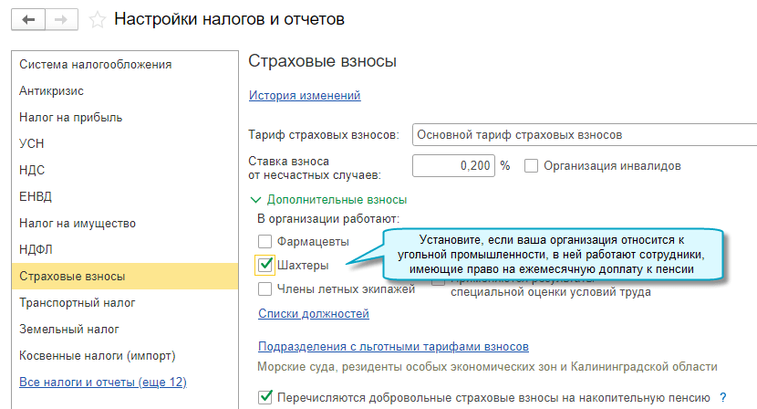 Полный интерфейс: меню "Главное - Настройки - Налоги и отчеты - Страховые взносы".