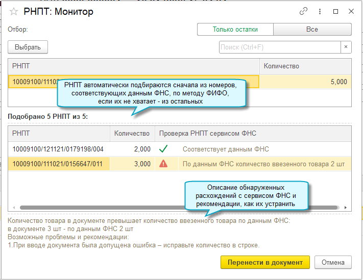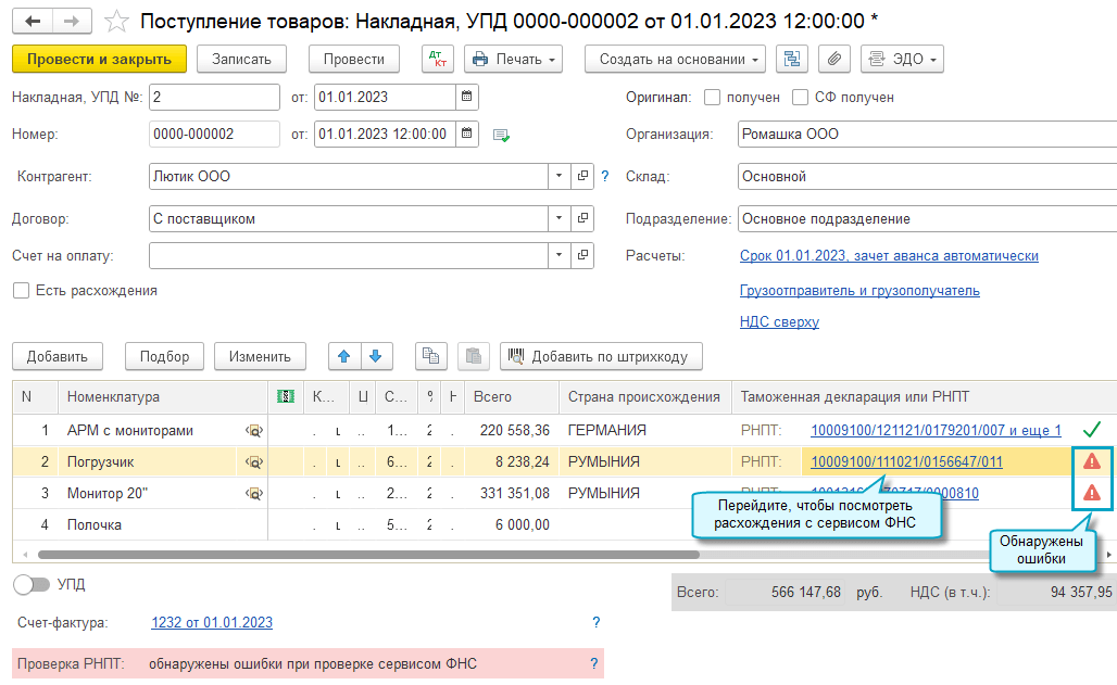 Добавлена возможность автоматически проверять РНПТ в документах. Сравниваются данные о РНПТ в документе и в сервисе ФНС "Проверка регистрационного номера партии товара (РНПТ)".