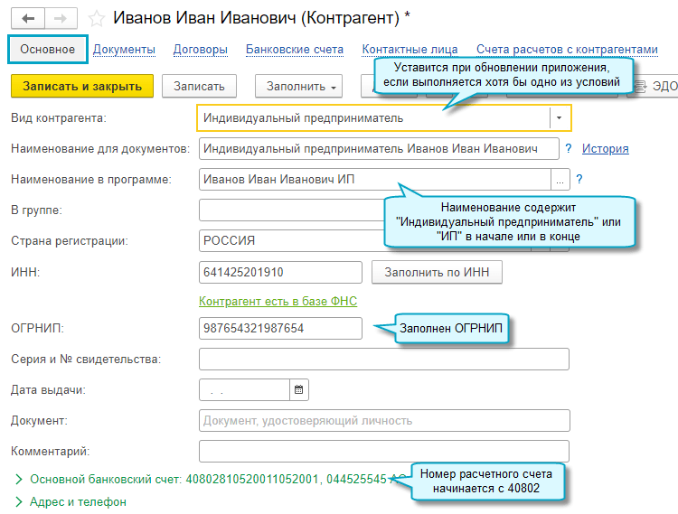 При обновлении приложения вид Индивидуальный предприниматель будет установлен автоматически в созданных ранее карточках контрагентов, если выполняется хотя бы одно из описанных ниже условий. Рекомендуется проверить карточки контрагентов.