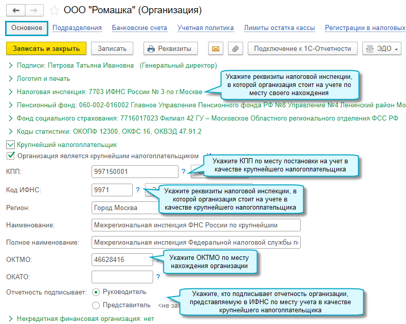 Для этого достаточно в реквизитах организации заполнить сведения о регистрации в налоговом органе в разделе "Крупнейший налогоплательщик".