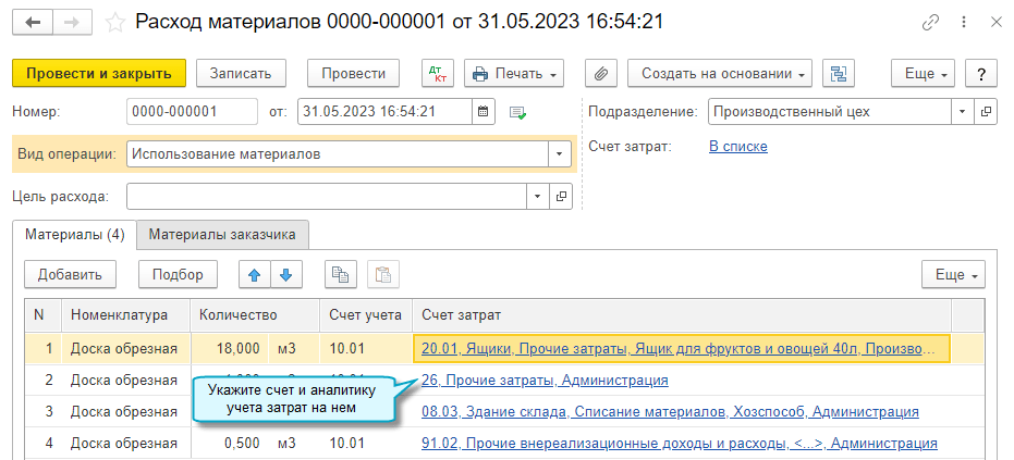 Добавлена возможность использовать один документ Расход материалов для списания материалов на разные цели. Например, когда поступившая партия материалов израсходована частично на производство продукции, частично на строительство основных средств. Для этого добавлена возможность указывать в списке любые счета затрат и аналитику, предусмотренную на них.