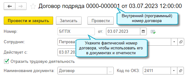 Добавлена возможность указать фактический номер договора подряда с любым сочетанием букв, цифр и символов. Именно этот номер используется при формировании печатной формы договора подряда и акта сдачи-приемки, заполнении формы ЕФС-1.