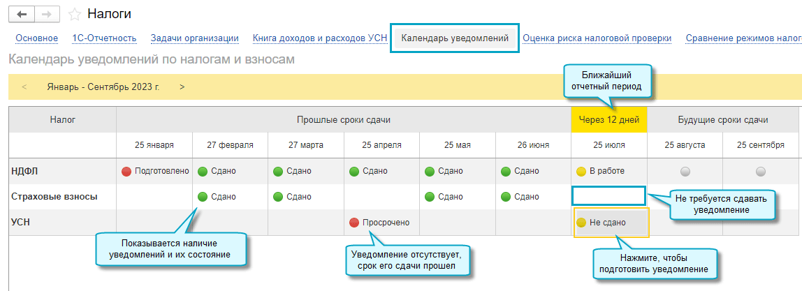 Добавлен календарь уведомлений по налогам и взносам. Теперь можно сразу по всем налогам проверить наличие уведомлений и их состояние, подготовить и отправить очередные по сроку уведомления.