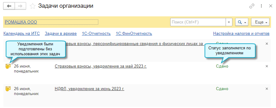 Статус задач организации по уведомлениям об исчисленных суммах налогов теперь обновляется и для случаев, когда уведомления создаются не через задачи, без использования помощников. Заполняется он на основе состояний уведомлений.