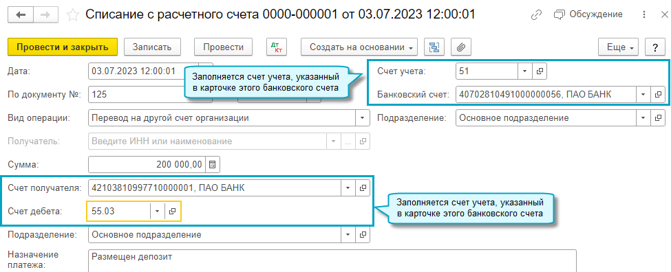 Для этого в карточки банковских счетов организации добавлен счет учета, на котором учитываются денежные средства. При обновлении он заполнится исходя из счета учета, указанного раньше вручную в документах Списание с расчетного счета, Поступление на расчетный счет, или самого номера банковского счета, если ещё не было операций по нему.