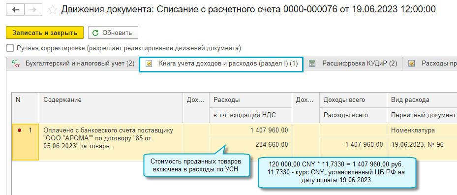 Расходы по УСН "доходы минус расходы" на товары с покупной стоимостью в валюте теперь пересчитываются в рубли по курсу ЦБ РФ на дату оплаты товаров поставщику. Обратите внимание, перепроведение ранее введенных документов может привести к изменению суммы расходов.