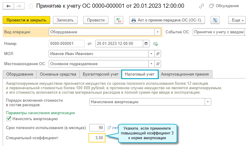Повышающие коэффициенты уменьшают срок, понижающие — увеличивают. Например, специальный коэффициент равный 3, сокращает срок полезного использования в три раза. Срок для списания убытка тогда определяется как разница между сокращенным сроком полезного использования и фактическим сроком эксплуатации основного средства (Письмо Минфина России от 06.04.2012 № 03-03-06/1/189, Письмо Минфина РФ от 23.11.2011 № 03-03-06/2/180).