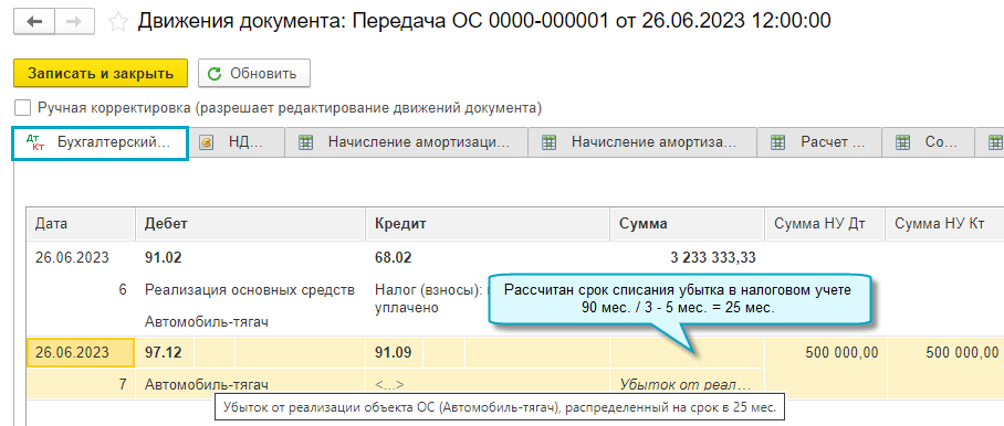 Такой расчет срока применяется при списании убытков, учтенных в налоговом учете на счете 97.12 "Убытки от реализации основных средств" автоматически при передаче основного средства.