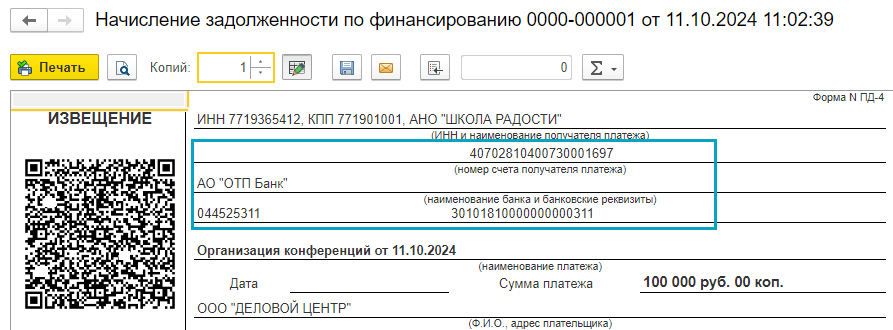 Добавлена возможность в Начислении задолженности по финансированию указать банковский счет, который будет выводиться при печати квитанций.