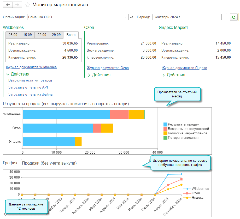 Теперь можно сравнить динамику продаж через разные маркетплейсы - Wildberries, Ozon и Яндекс.Маркет. Для этого добавлен отчет Монитор маркетплейсов по данным бухгалтерского учета.