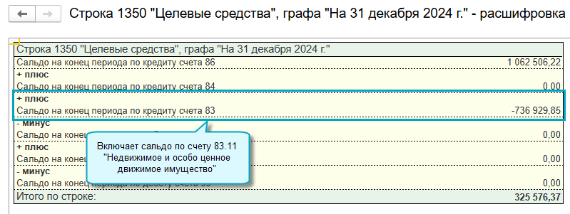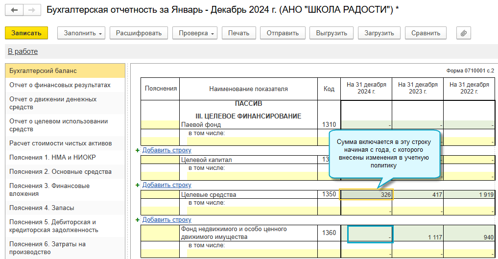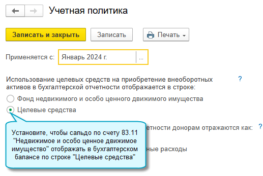 Добавлена настройка способа отражения в бухгалтерском балансе целевых средств, использованных на приобретение внеоборотных активов. Настройка позволяет отразить сумму в строке "Целевые средства" или, как в прошлых версиях, в строке "Фонд недвижимого и особо ценного движимого имущества".