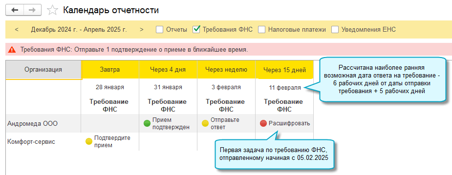 Отменена необходимость отправлять в ИФНС квитанции о приеме требований. Распространяется на требования, отправленные ИФНС начиная с 05.02.2025. В календаре отчетности после расшифровки требований теперь планируются задачи по отправке ответов (Федеральный закон от 08.08.2024 № 259-ФЗ).