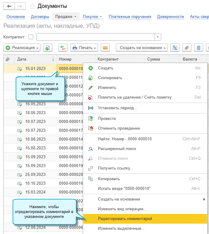 Добавлена возможность редактировать комментарии в документах, проведенных в закрытом периоде. Документы при этом не перепроводятся.