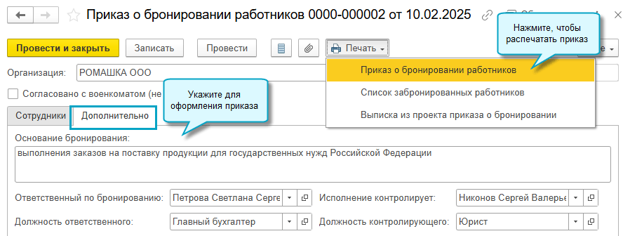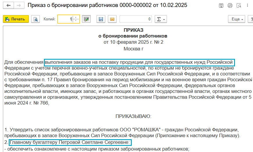 Печатные формы списка забронированных работников и выписки из проекта приказа о бронировании скорректированы в соответствие с постановлением Межведомственной комиссии по вопросам бронирования граждан РФ, пребывающих в запасе, от 27.11.2024 г. № 3пр-МВК.