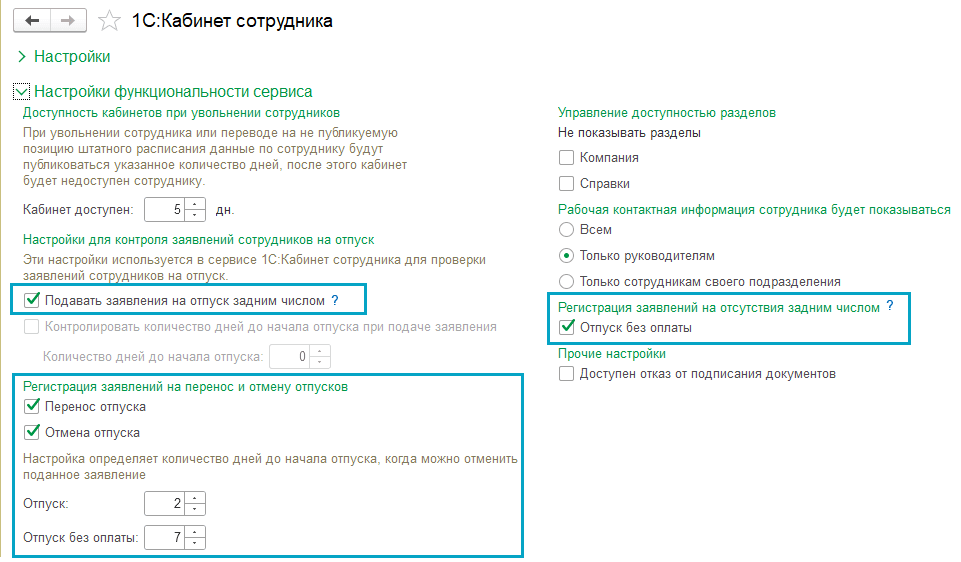 Простой интерфейс: меню "Сотрудники - Настройки - Сервис 1С:Кабинет сотрудника".