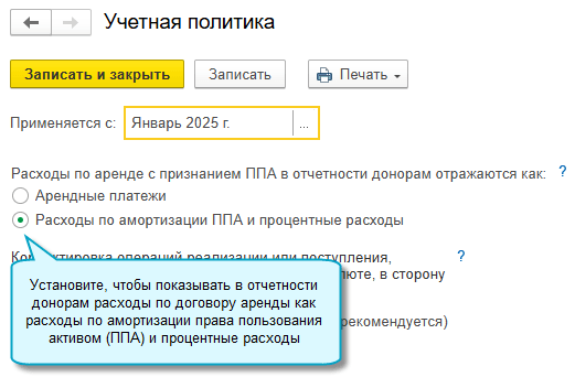 Добавлена настройка, как отражать в отчетности донорам расходы по договору аренды, по которому признаются права пользования предметом аренды (активом).