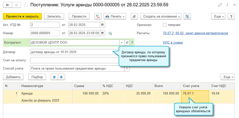 Полный интерфейс: меню "Покупки - Покупки - Поступление (акты, накладные, УПД) - Услуги аренды".