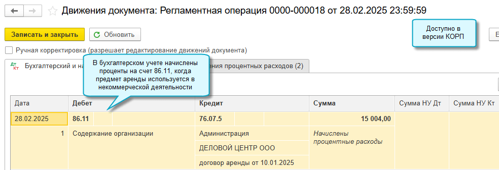 Полный интерфейс: меню "Операции - Закрытие периода - Закрытие месяца - Начисление процентных расходов".