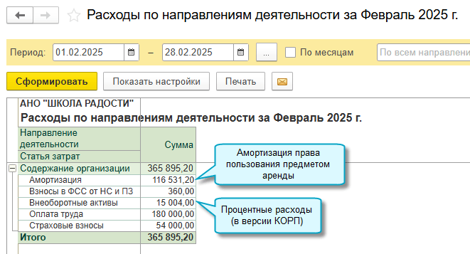 Полный интерфейс: меню "Деятельность - Отчеты - Расходы по направлениям деятельности".