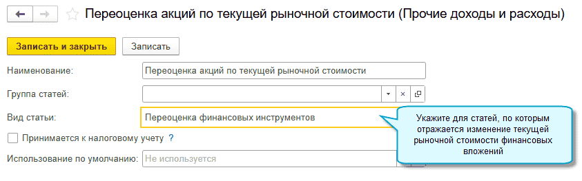 Добавлен вид прочих доходов и расходов "Переоценка финансовых инструментов". Укажите его для статей, по которым отражается переоценка финансовых вложений по текущей рыночной стоимости согласно п. 20 ПБУ 19/02 "Учет финансовых вложений". Эти данные используются для заполнения таблицы 5.1. "Наличие и движение финансовых вложений" пояснений к балансу.