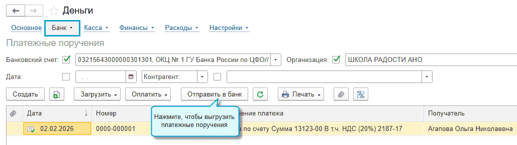 Добавлена возможность выгружать платежные поручения в файл, если подключен сервис 1С:ДиректБанк. Используйте такой способ в случаях, когда невозможно отправить платежные поручения в банк через сервис.