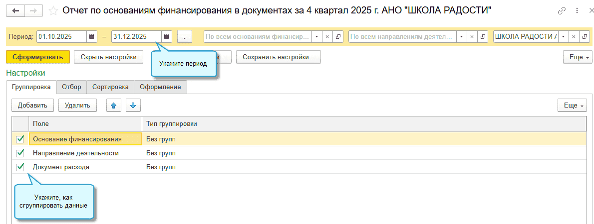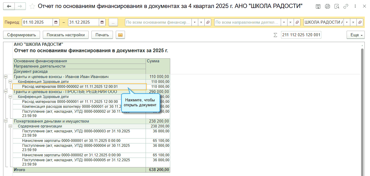 Отчет можно сформировать за произвольный период. Также можно выбрать по каким показателям и в какой последовательности группируются данные: по основанию финансирования, направлению деятельности и документу расхода. Из отчета можно открыть документ расхода и отредактировать его, если требуется.