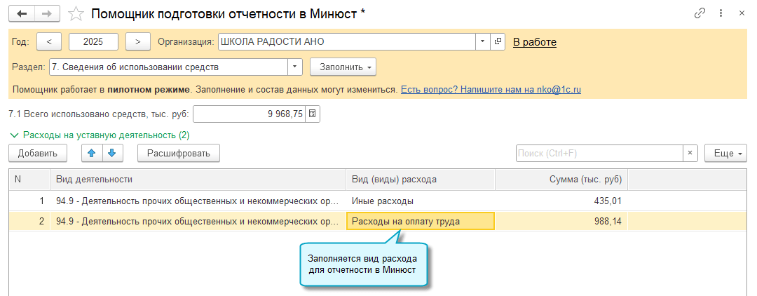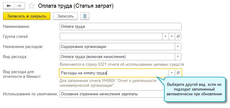 Расходы на уставную деятельность в разделе "7.Сведения об использовании средств" теперь расшифровываются по видам расходов для отчетности Минюст. Для этого вид расходов добавлен в справочник статей затрат.