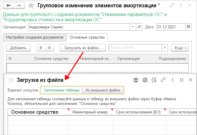 Обработка позволяет загрузить из табличного документа или подобрать из справочника объекты, по которым нужно изменить элементы амортизации, и массово создать документы Изменение параметров ОС и Корректировка стоимости и амортизации ОС.