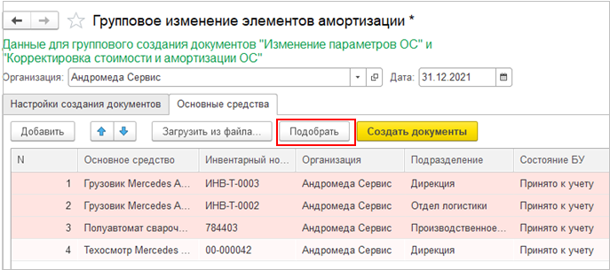 Для небольшого количества ОС можно заполнить список при помощи кнопки Подобрать. Строки, по которым документы не созданы или не актуальны, подсвечиваются красным. При подборе будут автоматически заполнены текущие значения элементов амортизации ОС. Их необходимо будет изменить вручную на пересмотренные значения.