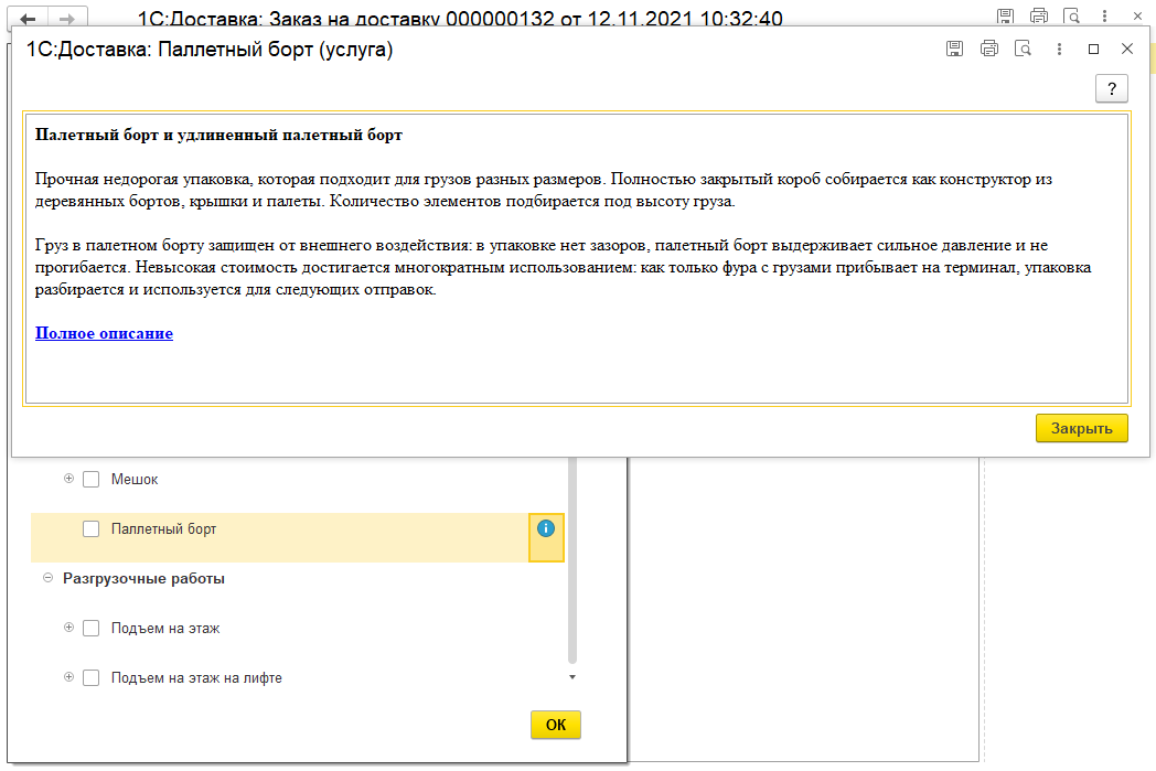 На закладке Тарифы можно указать дополнительные услуги, которые требуются при перевозке (дополнительная упаковка, подъем на этаж и т.д.). В ряде случаев по названию дополнительной услуги сложно понять, что означает и что включает в себя данная услуга. Для понимания назначения и таких дополнительных услуг предусмотрено отображение значка информации, по нажатию на который можно открыть краткое описание услуги, а также перейти на сайт перевозчика с полным описанием, при наличии такого описания.